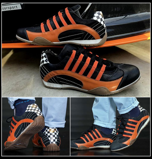 Chaussures pour homme Sport Sneaker Fabrication de qualité à la main - Doublure et renforts cuir Finition cuir retourné - Couleur noir / orange Matière 100% cuir / semelle caoutchouc Livré avec 2 paires de lacets : noir et orange Made in Italy 179 € TTC / Incl. Taxes