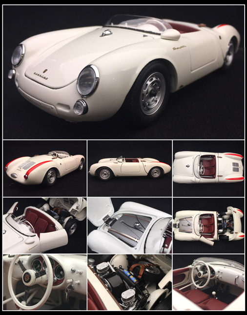 Schuco nous propose une magnifique reproduction de la Porsche 550 Spyder au 1/18, tout ouvrant, détaillée jusqu'aux clés sur le contact !