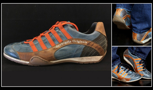 Chaussures pour homme Sport Sneaker Doublure et renforts cuir - Couleur bleu Monza indigo / orange / brun Livré avec 2 paires de lacets : orange et bleu marine Matière 100% cuir / semelle caoutchouc Made in Italy 179 € TTC / Incl. Taxes