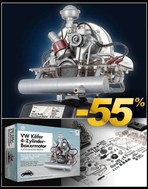 Moteur Boxer Flat-4 VW Coccinelle Réplique entièrement fonctionnelle 200 pièces à monter soi-même - Socle de présentation inclus Bouton de mise en marche avec cycle "son et lumières" Reproduction sonore du moteur - Fonctionne avec 3 piles AAA Livret 100 pages avec les instructions de montage Echelle 1/4 - Franzis 67038