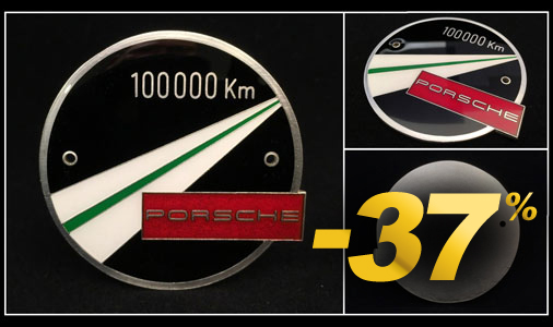 Badge de Grille Porsche 100 000 km 4 couleurs noir / blanc / vert / rouge - Surface émaillée à froid / Fond argenté Trous pour vis traités argent de chaque côté Vernis résistant aux intempéries - En métal, très rare Plaque nue, livrée sans vis de montage