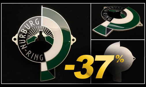 Badge de Grille Nürburgring 3 couleurs noir / blanc / vert - Surface émaillée à froid / Fond argenté Trous pour vis traités argent de chaque côté Vernis résistant aux intempéries - En métal, très rare Plaque nue, livrée sans vis de montage