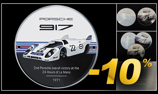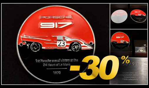 Badge de grille Porsche 917 n°23 - Vainqueur 24h du Mans 1970 50e anniversaire de la première victoire Porsche aux 24h du Mans 1970 Fabriqué en métal - Diamètre 9 cm - Kit de fixation inclus Inclus 1 autocollant pour l'extérieur, 1 autocollant pour l'intérieur des vitres Couleur Rouge / Noir / Blanc - Edition limitée 917 exemplaires numérotés Made in Germany - Porsche WAP0509170MSZG