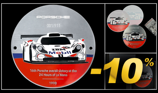 Badge de Grille Porsche 911 GT1 n°26 - Vainqueur 24h Le Mans 1998 Diamètre 9,5 cm - Matière 95% Zinc / 5% Acrylique Autocollant et vignette inclus pour intérieur et extérieur Kit de fixation sur le véhicule inclus - Fabriqué en Allemagne Porsche WAP0508120RGBD Edition limitée - 911 exemplaires