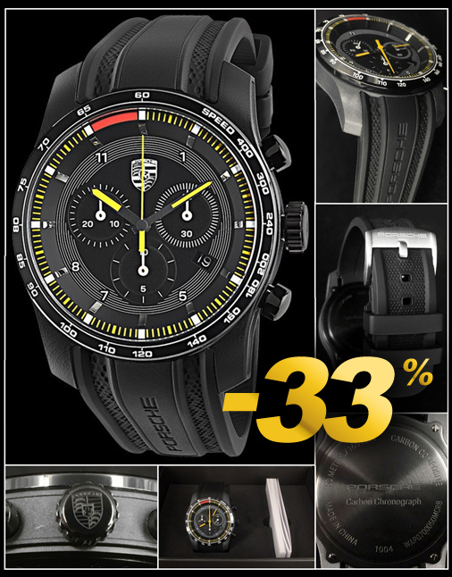 Montre Porsche Chronographe Carbon Composite Mouvement Suisse RONDA 13 rubis - Boîtier en alliage carbone avec finition satinée Bracelet caoutchouc 22 mm - Verre saphir traité antireflets - Guichet de date à 4 heures Fonction d'arrêt intégrée - Dos gravé avec numéro de série - Etanche à 50 mètres / 5 ATM Diamètre 42 mm - Epaisseur 12 mm - Garantie 2 ans Porsche WAP0700050MCRB