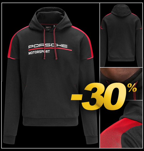 Hoodie homme Porsche Motorsport Grande poche devant avec 2 entrées latérales - Matière 78% Coton / 22% Polyester Capuche réglable - Couleur Noir / Rouge Porsche WAP124NFMS