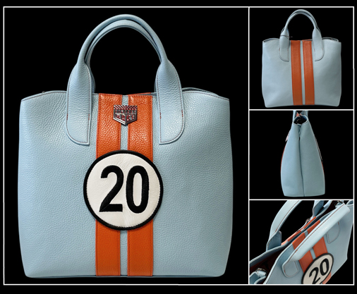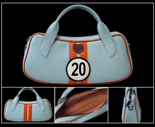 Sac à Main en cuir Vintage Race Matière 100% Cuir de veau - Doublure 100% coton - Dimensions 40 x 19 x 9 cm Couleur Bleu Clair / Orange - Fermeture zippée - Poignées et bandoulière Fabriqué artisanalement en Italie - Edition Limitée - 50 exemplaire numérotés 279,95 € TTC / Incl. Taxes