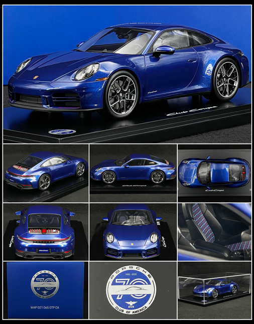Porsche 911 Carrera T Club Coupe 2024 - 70 years Porsche Club America Sholarblau 1/18 - Spark WAP0210650TPCA Edition Limitée - 992 exemplaires numérotés 299,95 € TTC / Incl. Taxes