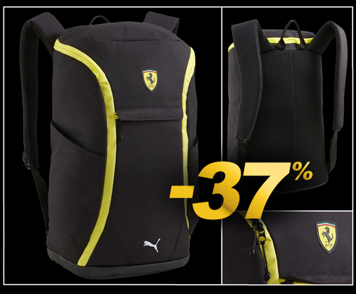 Sac à Dos Ferrari Matière 100% Polyester - Couleur Noir / Jaune - Bretelles réglables - Dos en filet mesh 1 grand compartiment principal zippé - Poche interne rembourrée pour ordinateur portable 1 poche zippée à l'avant - 2 poches latérales Puma 701228018-001