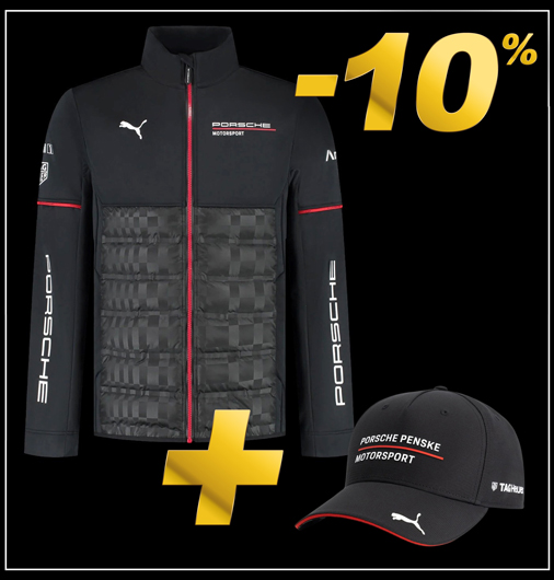 Veste + Casquette Porsche Motorsport Matière Veste 100% Polyester technique imperméable et respirant Matière Casquette 100% Polyester - Couleur Noir / Rouge Porsche WAP435SMSR + 701228639-001