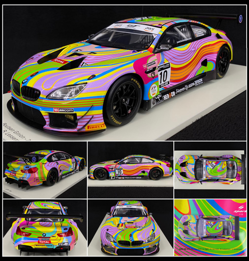 Perfect reproduction of the BMW M6 GT3 of the Thierry Boutsen team, 5th in class at the 2020 Spa 24h. At this 1/18 scale, the magnificent psychedelic decoration of Peter Halley comes into its own. An Art Car not to be missed.