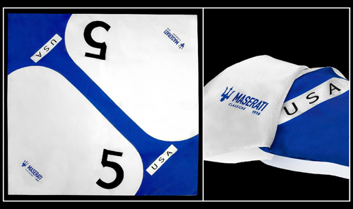 Foulard Maserati Tipo 61 Nürburgring 1960 Dimensions : 70 x 70 cm - Matière sergé 100% Soie naturelle Couleur Bleu / Blanc - Maserati MC800-200 49,95 € TTC / Incl. Taxes