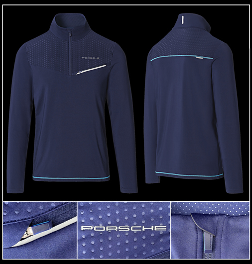 T-shirt manches longues homme Porsche Sport Collection Col montant et fermable par zip - 1 poche poitrine zippée Couleur Bleu marine / détails contrastant Bleu requin Matière 90% Polyester / 10% Elasthane Porsche WAP533M0SP 99,95 € TTC / Incl. Taxes