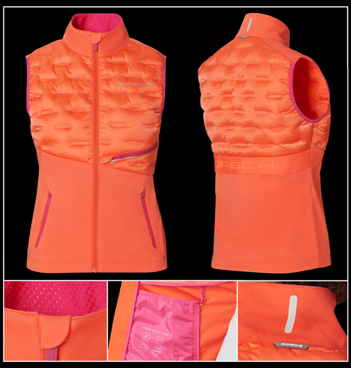 Veste sans manches femme Porsche Sport Collection Veste Softshell bi-matière chaude et confortable - Coupe-vent et imperméable Partie supérieure légèrement matelassée - Col montant droit - Fermeture par zip 2 poches sur le devant - 1 poche poitrine zippée - Matière 100% Polyester Eléments réfléchissants discrets devant et derrière Couleur Rose corail / détails contrastant Rose fuschia Porsche WAP536M0SP 149,95 € TTC / Incl. Taxes