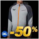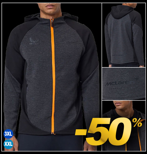 Hoodie homme McLaren F1 - Tailles XXL / 3XL seulement Veste à capuche - Matière 50% viscose / 45% Polyester /5% Elasthanne Fermeture par zip - 2 poches latérales zippées - Couleur Noir / Anthracite / Orange McLaren F1 Team TM1006
