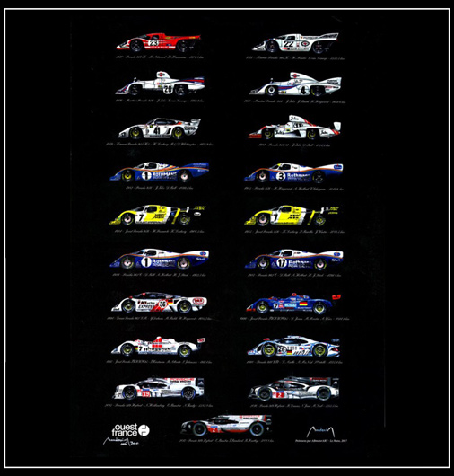 Poster Porsche Vainqueurs Le Mans - Edition 19 victoires Reproduction d'une oeuvre originale de Alain Baudouin Edition limitée - 300 exemplaires numérotés et signés Format 50 x 70 cm 29,95 € TTC / Incl. Taxes