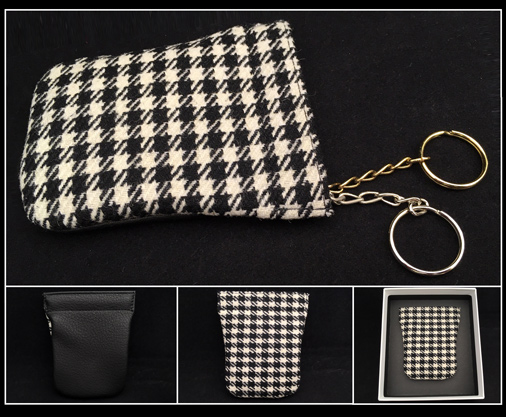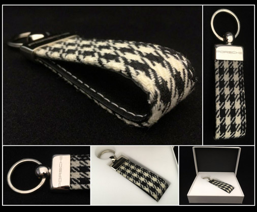 Porte-clés Porsche - Tissu Pepita 2 anneaux avec chaînettes - Matériel tissu / cuir / acier inoxydable Couleur damier noir et blanc - Dimensions 10,5 x 9 cm Fabriqué en Allemagne 99,95 € TTC / Incl. Taxes