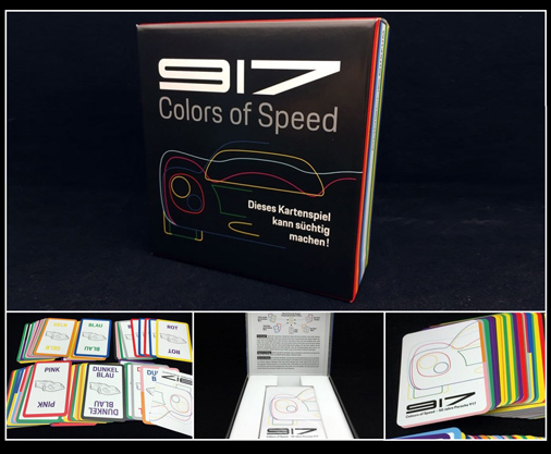 Jeu de Cartes Porsche 917 - Colours of Speed - 50 Jahre Porsche 917 Jeu de type 8 américain / Uno - 110 cartes couleur et joker Illustration de Porsche 917 - Dimensions 9 x 6 cm Boite en carton rigide 11.5 x 12.5 cm - Explications en allemand Porsche Design MAP07036019 9,95 € TTC / Incl. Taxes