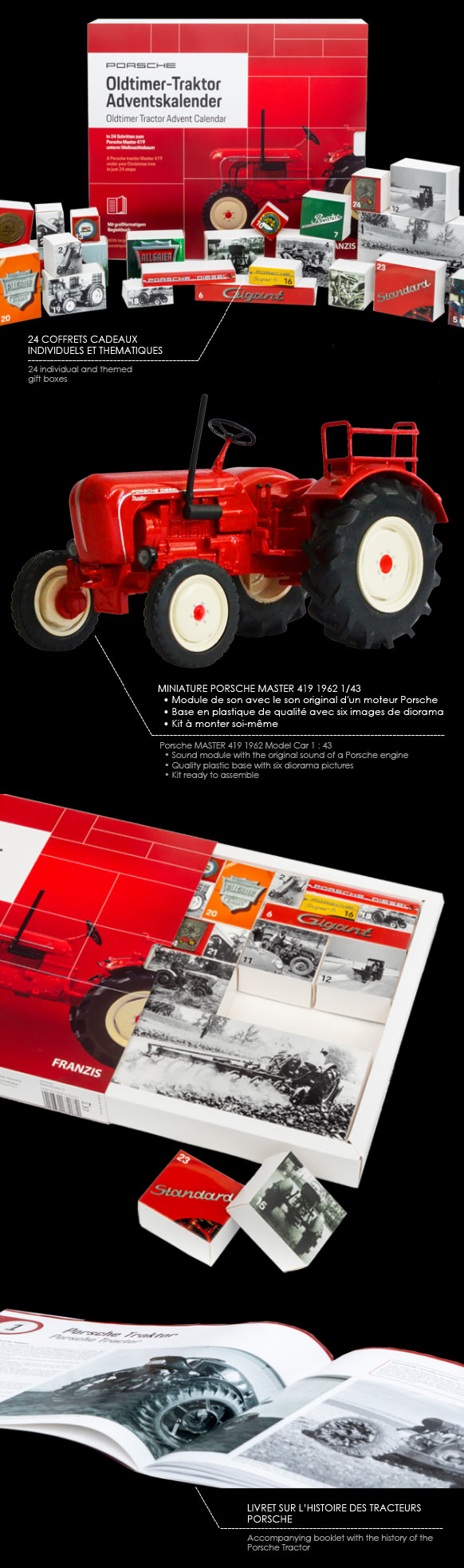 Calendrier de l'Avent - Porsche Oldtimer-Traktor 24 coffrets cadeaux individuels et thématiques Miniature Porsche Master 419 1962 - Rouge 1/43 - Kit de à monter soi-même Base en plastique de qualité avec diorama Module de son avec le son original d'un moteur Porsche Livret d'accompagnement sur l'histoire des tracteurs Porsche de 1950 à 1960 Requiert 2 piles 1,5 V (AA) non incluses 59,95 € TTC / Incl. Taxes