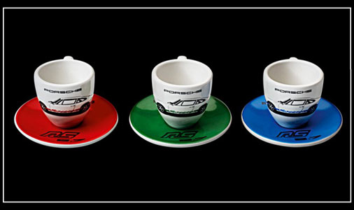 Set de 3 Tasses Expresso - Porsche 911 Carrera RS 2.7 Couleur rouge indien / bleu glacier / vert viper Hauteur 5,4 cm - Diamètre 5,8 cm Diamètre soucoupe 9,4 cm Fabriqué en Allemagne Porsche Design WAP0500300G Livré en coffret carton