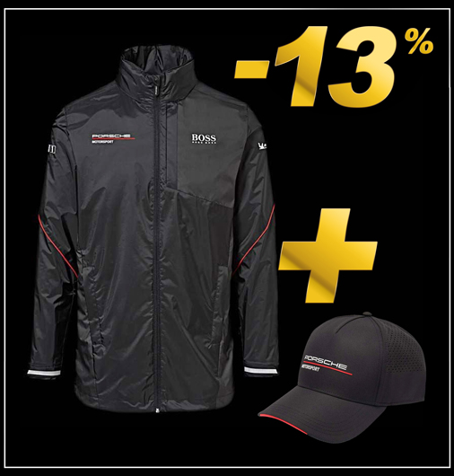 Duo Veste homme + Casquette Porsche Motorsport Matière Veste 100% polyamide - Couleur Noir / Rouge / Blanc 2 poches latérales - Fermeture zippée - Capuche repliable dans le col Matière Casquette 100% Polyester - Taille réglable - Couleur Noir Porsche WAP438L0MS + WAP8000010LFMS