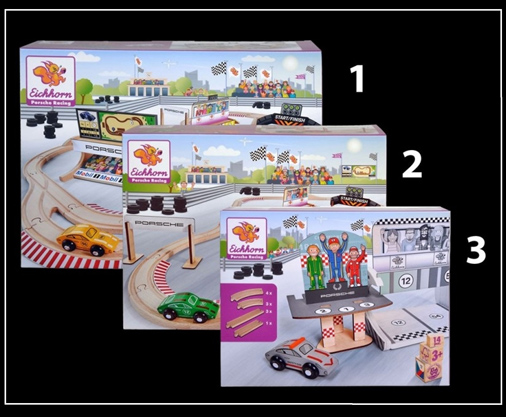 Set Circuit Porsche Racing en bois pour enfant Longueur de piste 1000 cm - Encombrement au sol 125 x 125 cm Avec 6 voitures et accessoires - En bois PFC / métal - 98 pieces au total Eichhorn 109475850 + 109475855 + 109475860