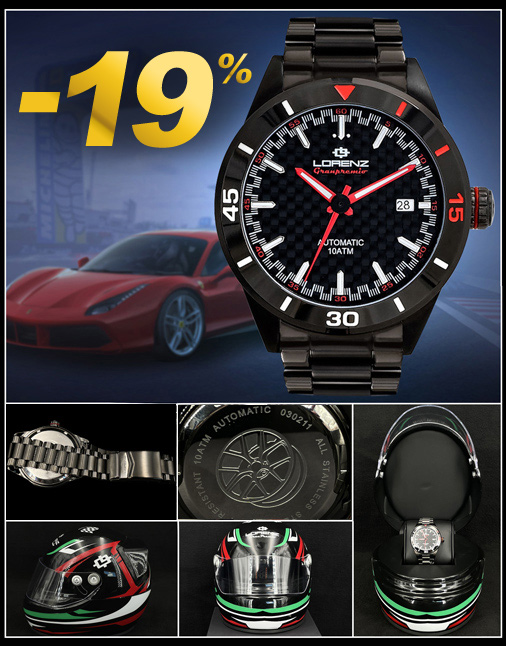 Montre Automatique Lorenz Granpremio Mouvement automatique Seiko NH35 - Bracelet en acier - Cadran en acier ip gunmetal Diamètre 42 mm - Verre minéral de haute qualité - Fermoire de sécurité Livret d'instructions et Etuis spécial en forme de casque inclus Etanche 10 ATM - Couleur : Noir / Rouge Lorenz 030211AA
