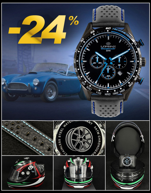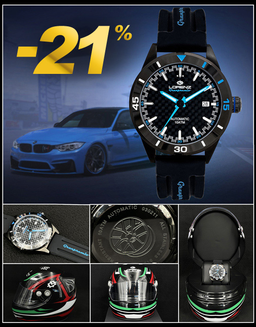 Montre Automatique Lorenz Granpremio Mouvement automatique Seiko NH35 - Bracelet en silicone noir, inscription bleues Cadran en acier ip gunmetal - Diamètre 42 mm - Verre minéral de haute qualité Fermoire par boucle en acier - Livret d'instructions et Etuis spécial en forme de casque inclus Etanche 10 ATM - Couleur : Noir / Bleu Lorenz 030211DD