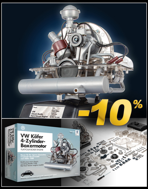 Moteur Boxer Flat-4 VW Coccinelle Réplique entièrement fonctionnelle 200 pièces à monter soi-même - Socle de présentation inclus Bouton de mise en marche avec cycle "son et lumières" Reproduction sonore du moteur - Fonctionne avec 3 piles AAA Livret 100 pages avec les instructions de montage Echelle 1/4