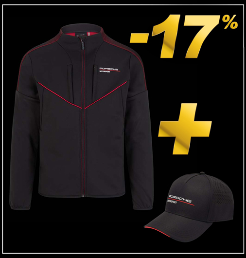 Duo Veste homme + Casquette Porsche Motorsport Matière Veste 86 % polyester / 14 % Elasthanne - Couleur Noir / Rouge Matière Casquette 100% Polyester - Taille réglable - Couleur Noir Porsche WAP120NFMS + WAP8000010LFMS