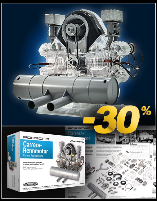 Moteur Porsche 550 Boxer Flat-4 Type 547 Fuhrmann Réplique entièrement fonctionnelle 310 pièces à monter soi-même - Socle de présentation inclus Bouton de mise en marche avec cycle "son et lumières" Reproduction sonore du moteur - Fonctionne avec 3 piles AAA Superbe manuel illustré en anglais et allemand, format A4 1/3 - Porsche MAP09054718