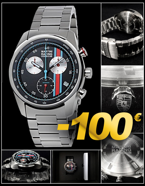Montre Porsche Martini Racing Mouvement Suisse ETA G10.212 AB 4 rubis - Boîtier acier inoxydable satinée Bracelet métallique 22 mm - Verre saphir traité antireflets Guichet de date à 4 heures - Fonction d'arrêt intégrée Dos gravé avec numéro de série - Etanche à 100 mètres / 10 ATM Diamètre : 42 mm - Epaisseur 12 mm - Garantie 2 ans Fabriqué en Suisse - Porsche WAP0700710LMRC