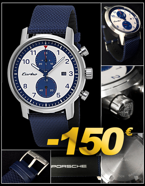 Montre Chronographe Porsche Turbo Classic Mouvement Suisse Ronda avec 4 rubis - Boitier en acier inoxydable Aiguilles luminescentes - Bracelet tissu bleu / cuir noir avec boucle en acier inoxydable Verre antireflets saphir - Etanche à 100 mètres - Diamètre 44 mm - Epaisseur 10 mm Garantie 2 ans - Fabriquée en Suisse Porsche WAP0700880LCLC
