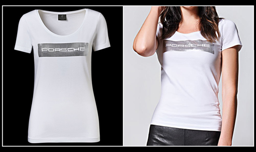 T-shirt femme Porsche Essential Motif argent brillant - Couleur blanc / gris - Col rond échancré Matière 95% Coton / 5% Elasthanne Porsche Design WAP825 49,95 € TTC / Incl. Taxes