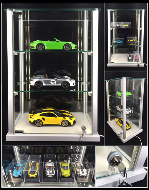 Vitrine éclairage LED - Juqu'à 15 miniatures 1 : 43 Dimensions 43 x 26 x 61,8 cm - 2 étagères / 3 niveaux de présentation Éclairage à bandes LED (4500 K) - Couleur Aluminium / Verre 4 pieds caoutchouc antidérapant - Hauteur des niveaux réglable Profilé aluminium 25 x 25 mm - 1 porte en verre avec serrure Fabriqué en Allemagne - Livré pré-monté et prêt à poser 439,95 € TTC / Incl. Taxes