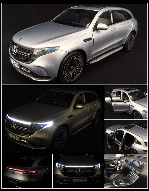 Mercedes-Benz ECQ 400 4matic Portières ouvrantes - Feux avant / arrière fonctionnels 3 positions : feux de position, feux de croisement, feux de route Gris argent métallisé 1/18 - NZG NZGA067772 169,95 € TTC / Incl. Taxes