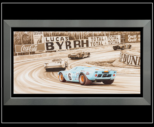Reproduction d'une peinture originale de François Bruère Ford GT40 Gulf - Vainqueur 24h Le Mans 1969 40 x 60 cm - Cadre aluminium brossé gris plomb - papier Velin d'Arches 250 g/m2 Edition limitée 300 exemplaires numérotés et signés 99,95 € TTC / Incl. Taxes