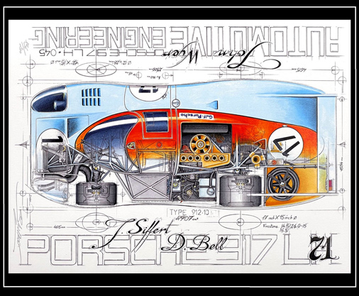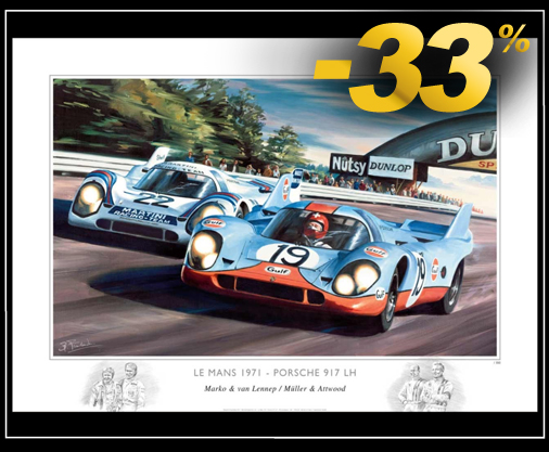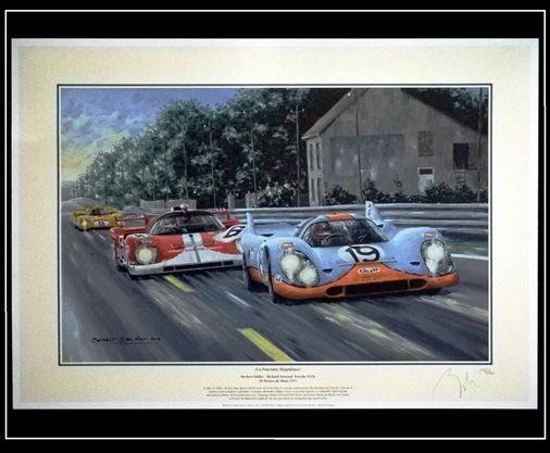 Reproduction d'une peinture originale de Benoît Deliège Porsche 917 K Gulf - 24h Le Mans 1971 50 x 70 cm - Edition limitée 200 exemplaires numérotés et signés 59,95 € TTC / Incl. Taxes