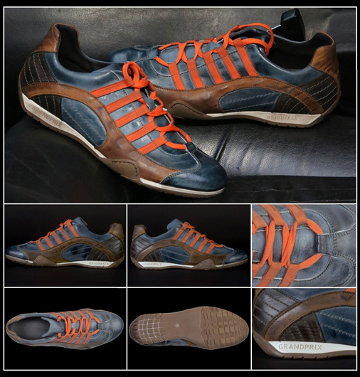 Chaussure en cuir homme style pilote Matière 100% cuir de vache / Semelle caoutchouc - Couleur bleu Monza indigo / orange / brun Doublure et renforts cuir - Talon arrondi adapté à la conduite sportive Livré avec 2 paires de lacets : orange et bleu marine 189 € TTC / Incl. Taxes