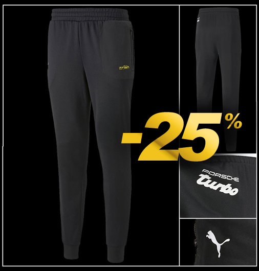 Pantalon homme Porsche 911 Turbo - Tailles XS / S / M seulement 2 poches zippées - Matière 59% polyester / 41% coton Taille et chevilles élastiquées - Couleur Noir Puma 534828-01