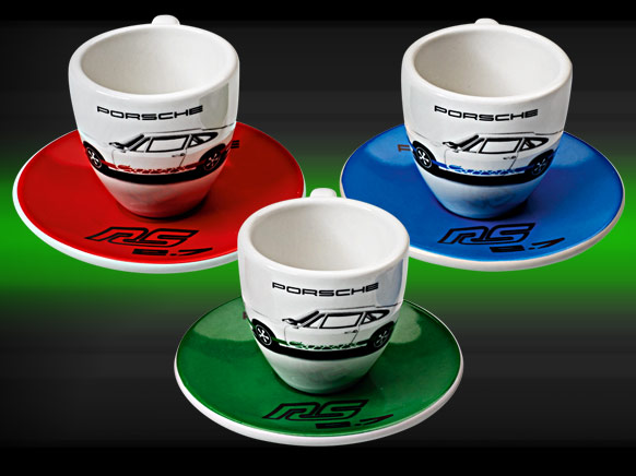 Set 3 Tasses Porsche 911 Carrera RS 2.7 avec soucoupe Couleur rouge indien / bleu glacier / vert viper Passe au lave-vaisselle Hauteur 5.4 cm, Diamètre 5.8 cm Diamètre soucoupe 9.4 cm Fabriqué en Allemagne Porsche WAP0500300G