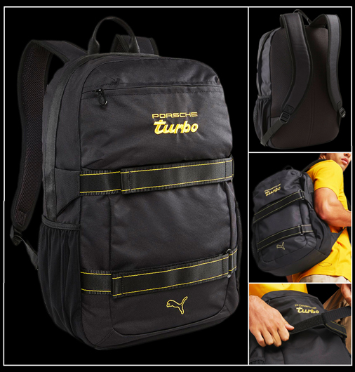 Sac à dos Porsche Turbo by Puma Grand compartiment zippée - Bretelles rembourrées réglables - 1 poche zippée devant Matière Toile enduite 88% polyester / 12% polyurethane - Doublure 100% Polyester 1 poche intérieur plaquée - Dos renforcé avec aération tissu mesh Dimensions 17,5 x 7 x 25,5 cm - Couleur Noir / Jaune Puma 079834_01 69,95 € TTC / Incl. Taxes