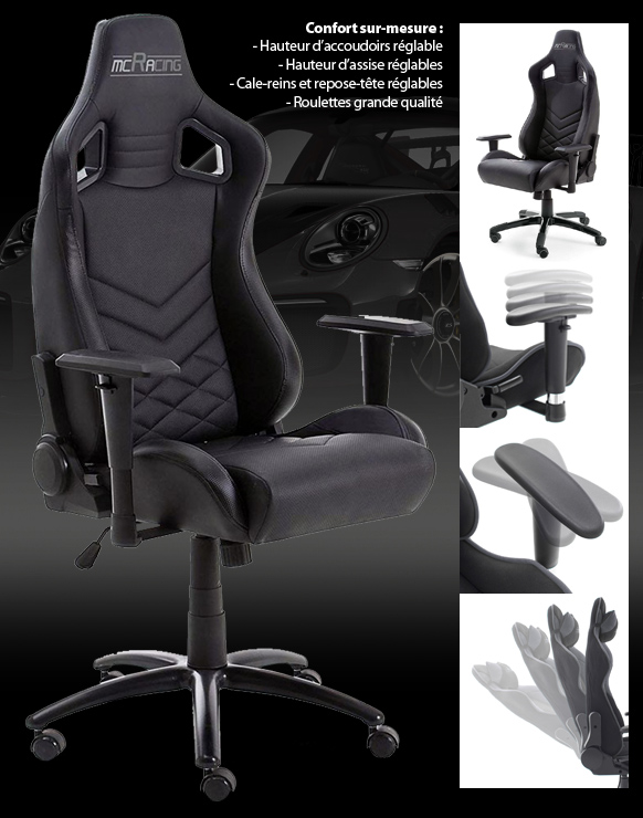 Fauteuil de Bureau ergonomique - Racing RS Coussins cale-reins et repose-tête réglables - Dossier inclinable jusqu'à 135° Couleur Noir - Accoudoirs réglables en hauteur + inclinaison Assise réglable en hauteur 45-55 cm - Piétement étoile avec 5 roulettes Matière simili cuir 100% Polyester - LxHxP : 74 x 125/135 x 54 cm 259,95 € TTC / Incl. Taxes