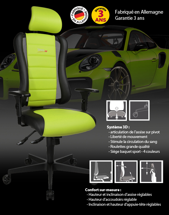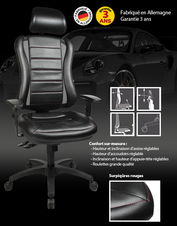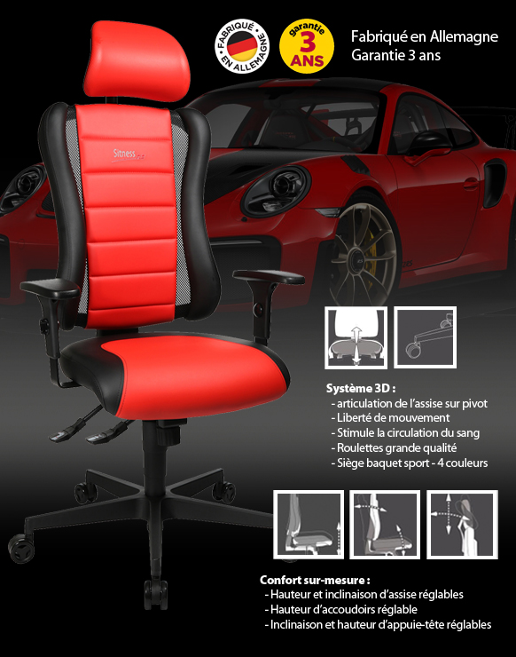 Fauteuil de Bureau Sitness RS Réglage synchrone de l'inclinaison de l'assise et du dossier - système de fixation en continu Conçu pour une durée d'assise longue - Appuie-tête et accoudoirs réglables Dossier en résille et rembourré pour un soutien optimal du dos Assise galbée réglable en hauteur - Revêtements simili cuir Assise articulée assurant une mobilité tridimensionnelle de la surface d'assise Piétement étoile avec 5 roulettes doubles Poids : 15kg - LxHxP : 50 x 126/139 x 48 cm Made in Germany - Garantie 3 ans