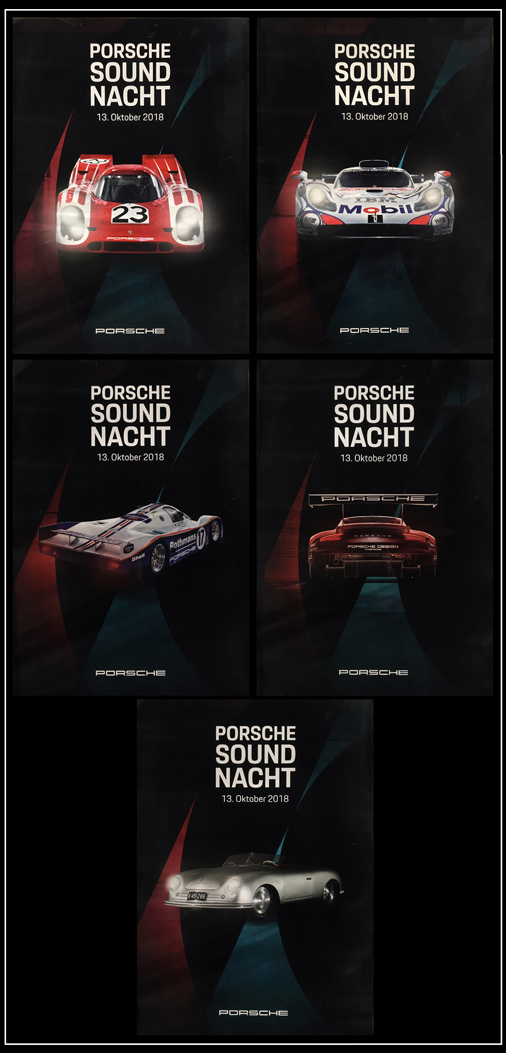 Set 5 Posters Porsche Sound Nacht 2018 série complète originale - Rare ! Dimensions de chaque affiche : 59 × 84 cm
