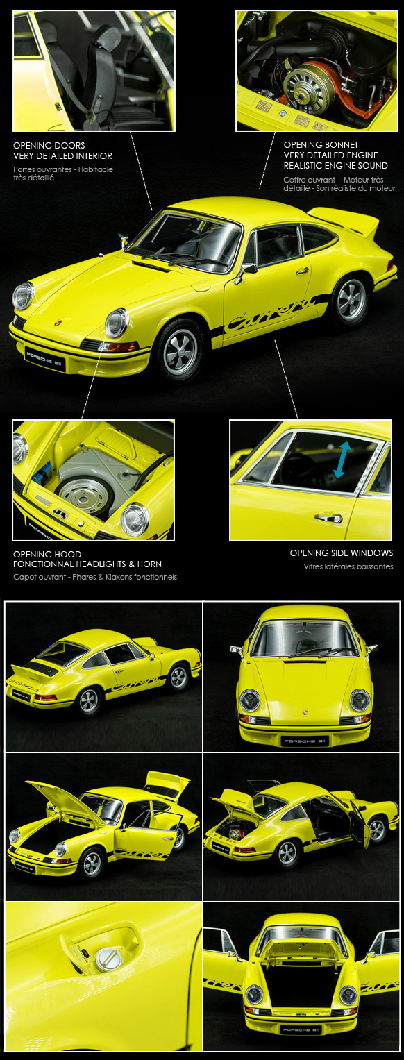 Kit MONTÉ Porsche 911 Carrera RS 2.7 1973 Modèle déjà monté et prêt à l'utilisation Portes, capot et coffre ouvrants - Phares fonctionnels - Sons réalistes du moteur et du klaxon Intérieur identique au réel vous permettant de replonger au coeur de la course Jaune / Bandes Noires 1/8 - Ixo Models 1399,95 € TTC / Incl. Taxes