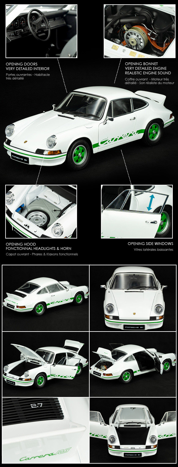 Kit MONTÉ Porsche 911 Carrera RS 2.7 1973 Modèle déjà monté et prêt à l'utilisation Portes, capot et coffre ouvrants - Phares fonctionnels - Sons réalistes du moteur et du klaxon Intérieur identique au réel vous permettant de replonger au coeur de la course Blanc / Bandes Vertes 1/8 - Ixo Models 1399,95 € TTC / Incl. Taxes