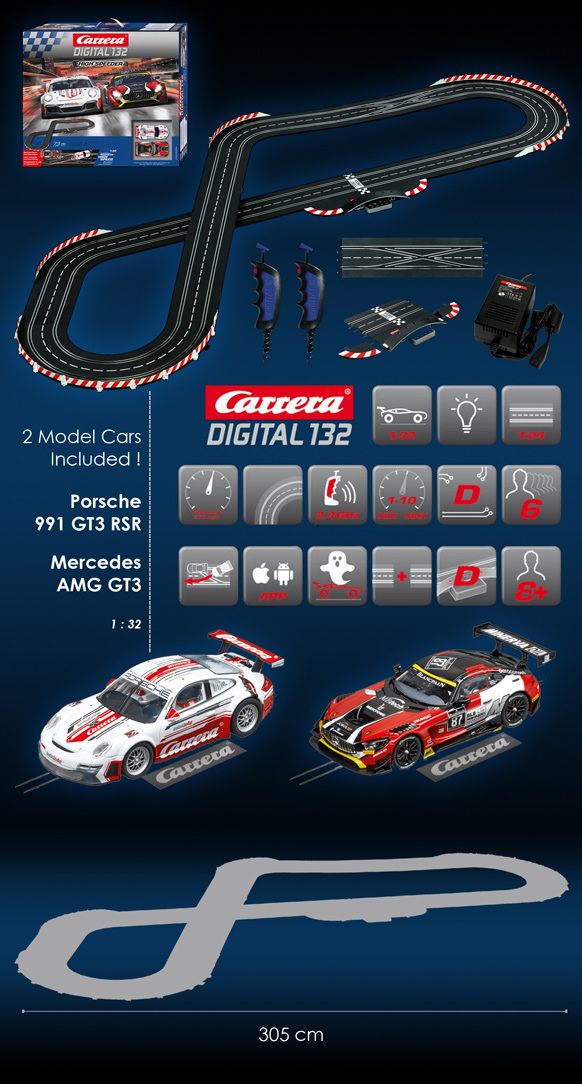 Circuit Carrera Digital Porsche / Mercedes High Speeder 2 voitures GT Porsche 911 GT3 RSR / Mercedes AMG GT3 Jusqu'à 6 voitures avec changement de voie, phares et feux stop Vitesse et freinage réglables individuellement Longueur de circuit 7,30 m 1/32 - Carrera 20030003