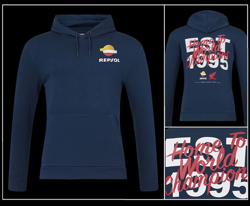 Hoodie Repsol Honda Moto GP Capuche avec cordons de serrage - Fermeture par zip Couleur Bleu Pageant - Matière 80% Coton / 20% Polyester Honda Racing TM6854-190 79,95 € TTC / Incl. Taxes