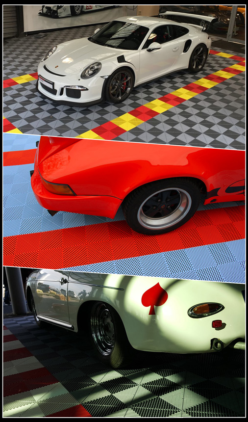 At last you can enhance your own garage with the same floor tiles that Porsche use: simple to install, just snap them together, made in Germany backed by a 20 year guarantee. Not only can we provide you with a customized quotation on request, but you can order the tiles yourself directly online too, as they are already in stock.